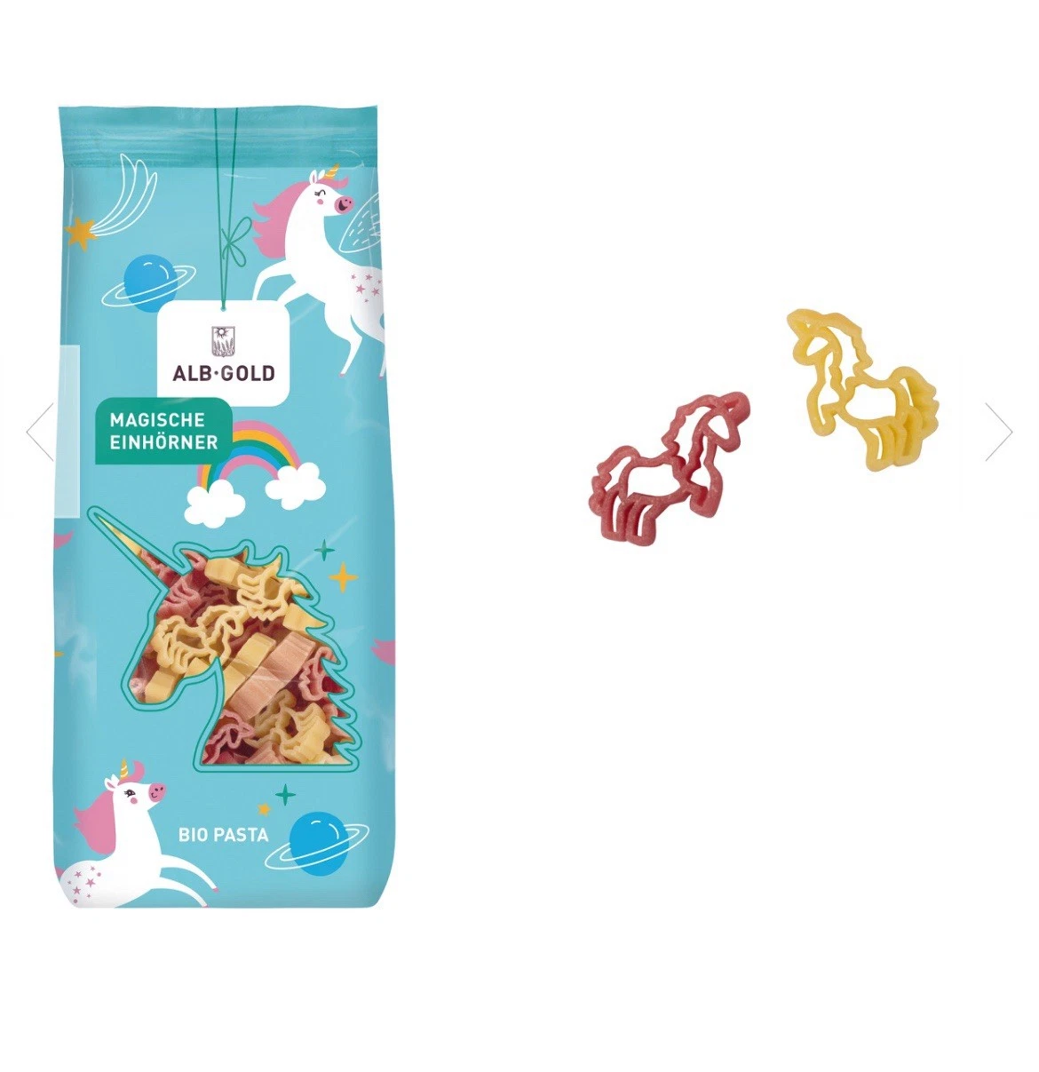 Ein Teil der Einhorn Pasta-Formen ist mit natürlichem Gemüsekonzentrat leicht rosa eingefärbt und verleiht jedem Gericht einen besonderen, farbenfrohen Touch – ganz ohne Zusatzstoffe!