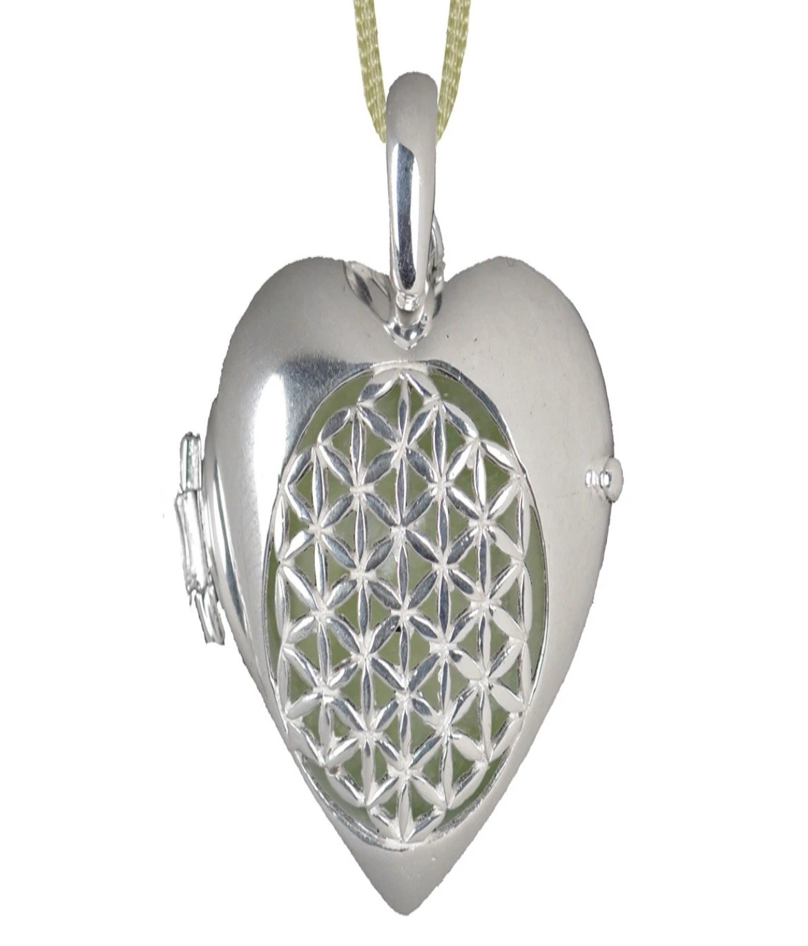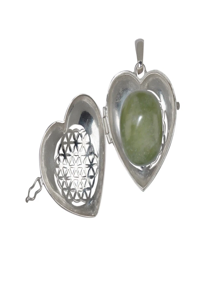 Durch das filigrane Muster mit der Blume des Lebens auf der Vorderseite ist dieser dann sichtbar, ruht aber sicher im Inneren des Medaillons.