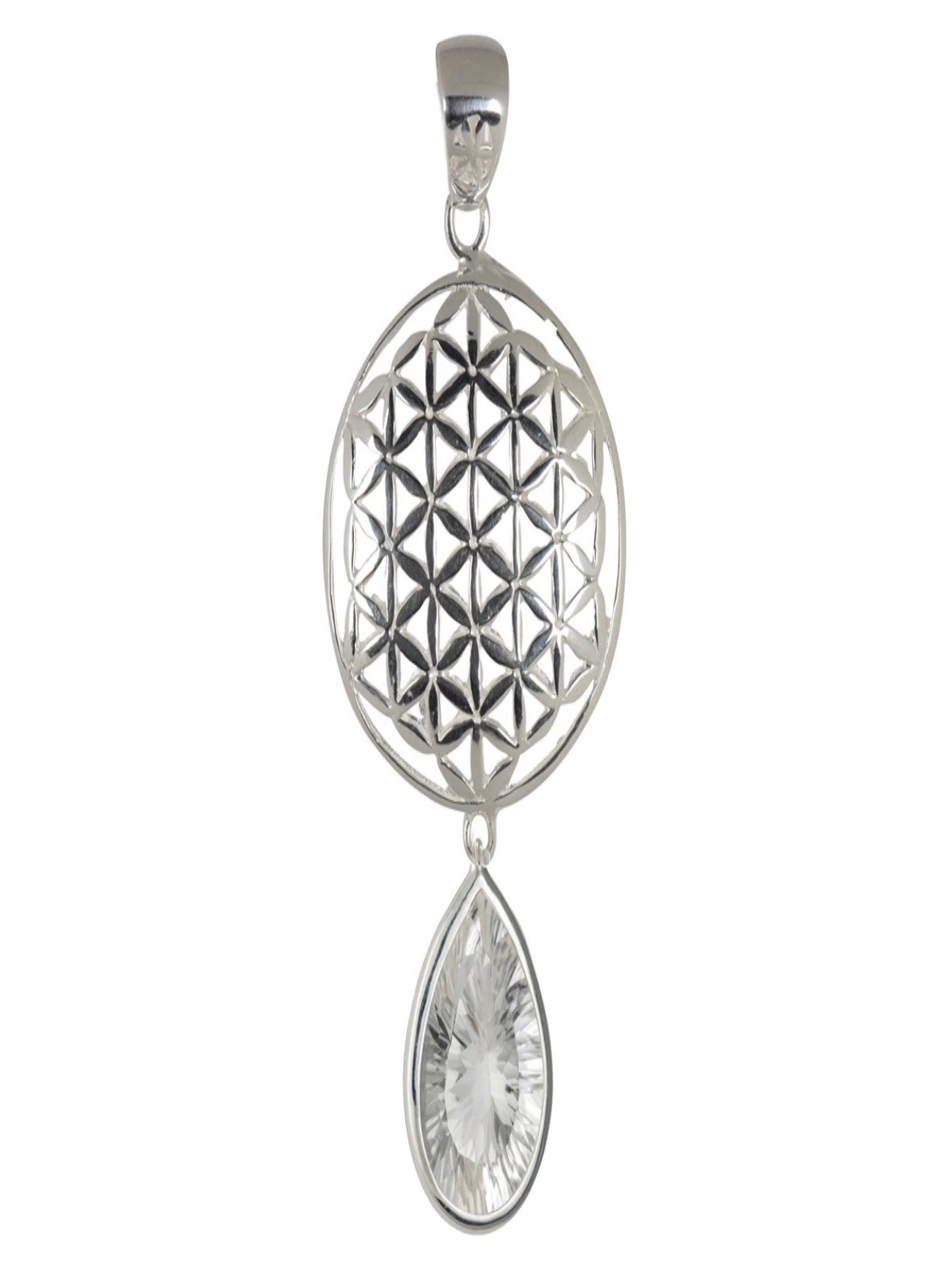 Bei diesem Design-Anhänger ist unten an der Blume des Lebens (Durchmesser 2,5cm) ein facettierter Tropfen aus Bergkristall (13 x 17mm) befestigt.