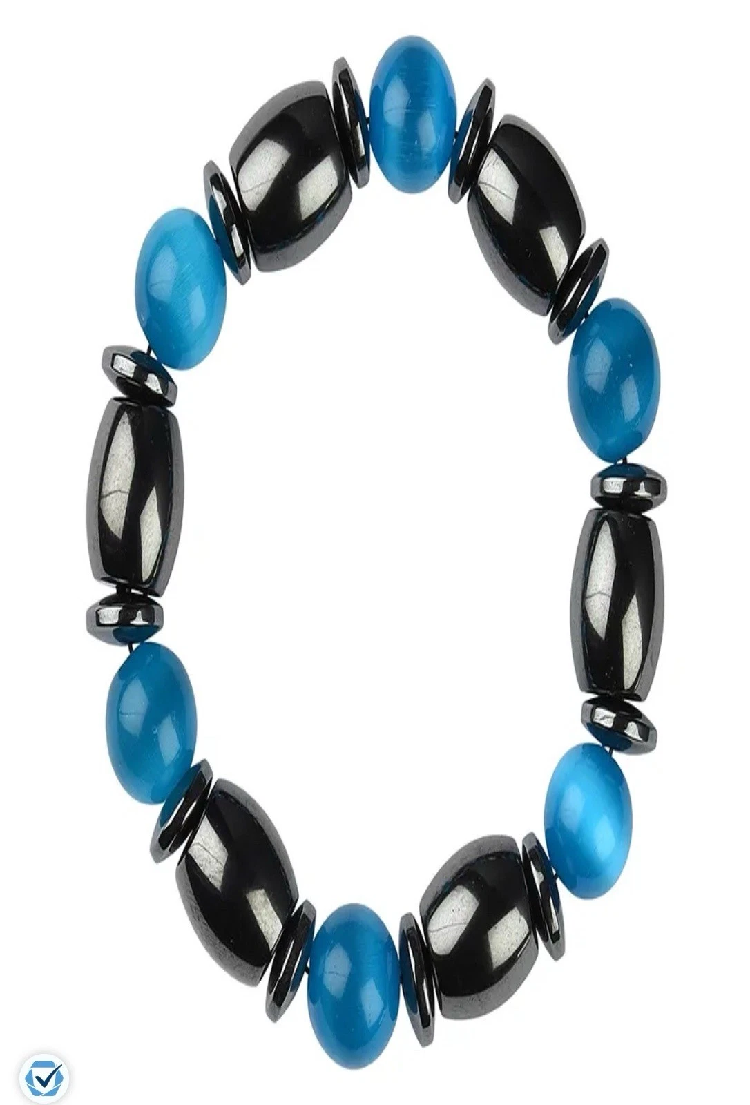 Die Hämatin-Elemente haben einen Durchmesser von ca. 10mm, die Kugeln aus blauem Katzenauge (Glas) sind 12mm groß. Das Armband ist auf Elastikfaden gefädelt; Länge des Armbands ca. 19cm