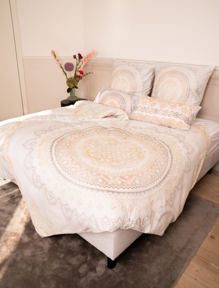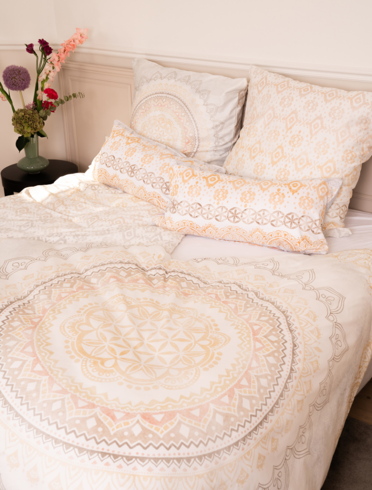 Lassen Sie Ihre Seele erstrahlen. Nicht nur Ihre Haut, sondern auch Ihre Seele wird sich über diese wundervolle Bettwäsche freuen. Das ornamentale Mandala in seinen zarten und warmen Naturtönen ist eine wahre Augenweide. Die positive Energie der Lebensblume, der ein Rosenquarz und die hochwertige Bio-Baumwolle schenken Ihnen ein unvergleichliches Gefühl von Selbstvertrauen, Erfüllung, Glück, Geborgenheit und Wohlbefinden. Wenn Sie es etwas dezenter mögen, drehen Sie die Bettwäsche einfach um und lassen Sie den ethnischen Druck seine Magie entfalten. Lassen Sie Ihre Seele erstrahlen und Ihre Träume wahr werden.