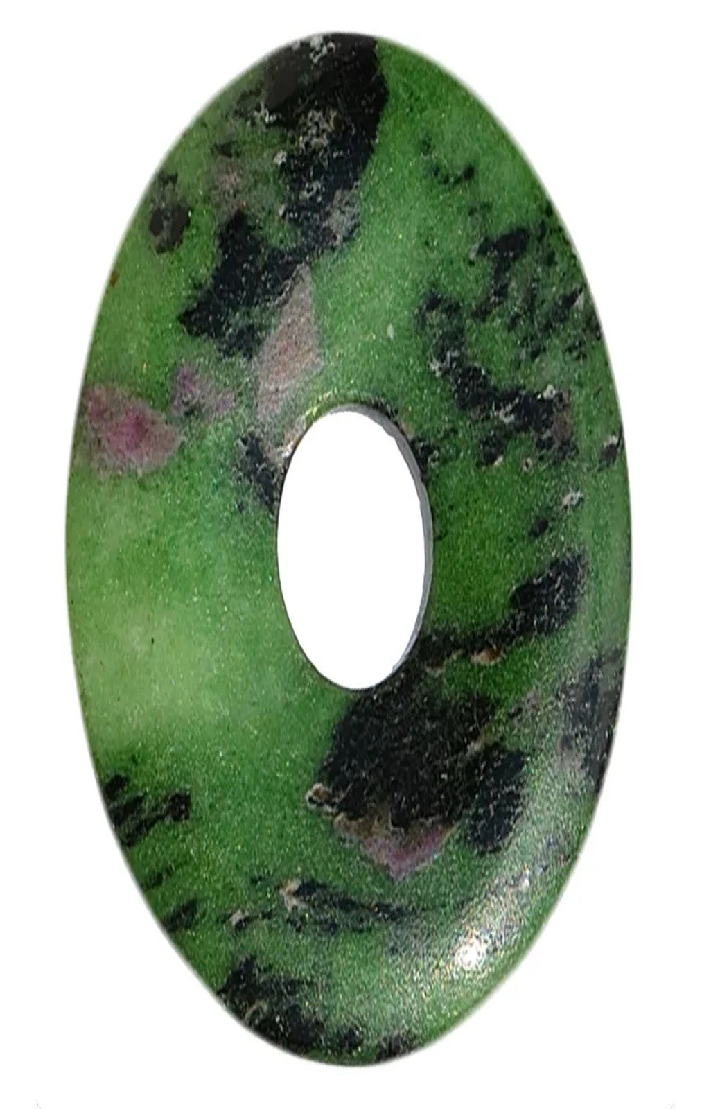 Donut Zoisit/Rubin   Größe: ca. 60 mm   Zoisit mit Rubin wird auch Anyolith oder Rubinzoisit genannt.   Bei einigen Großhändlern wird der Zoisit aufgrund seiner grünen Farben und den schwarzen Einschlüssen auch als Kiwistein oder Kiwistone bezeichnet.