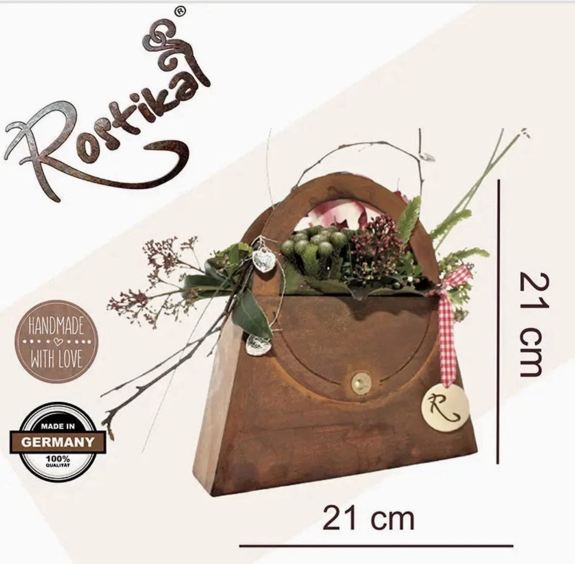 Metall Deko Tasche zum Bepflanzen – Edelrost Gartendeko Pflanzgefäß für Ihr zuhause oder als Geschenk Idee Geschenkidee: Die Rost Deko Tasche eignet sich perfekt als Geschenk zum Hochzeitstag, Geburtstag, Valentinstag und Muttertag. Schön im Verbund mit Blumen, Pflanzen & Vasen ➤ TIPP: Zum Bepflanzen oder Dekorieren der Tasche eine Milch- oder Tetraverpackung abschneiden und mit Erde oder Steckschwamm befüllen. Mit Topfpflanzen und Schnittblumen bepflanzen und fertig ist die perfekte Tisch- oder Gartendeko. 35 x 35 cm: * Höhe: ca. 35 cm ✓ * Länge: ca. 35 cm