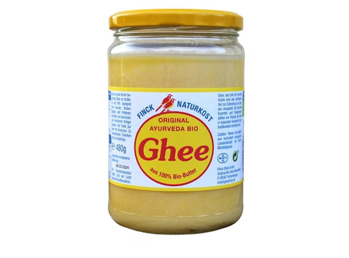Das Bio Ghee von Finck Naturkost wird aus 100% Bio-Butter hergestellt. Es enthält wertvolles Fett und ist bekannt aus der Ayurvedischen Küche.