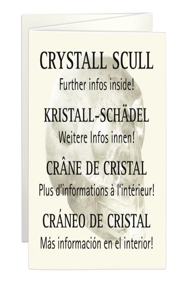 Der gravierte Totenkopf wird in der beliebten Geschenkschachtel mit kleinem, viersprachigem Beileger zur Symbolik der Kristall-Schädel (Deutsch, Englisch, Französisch, Spanisch) geliefert.