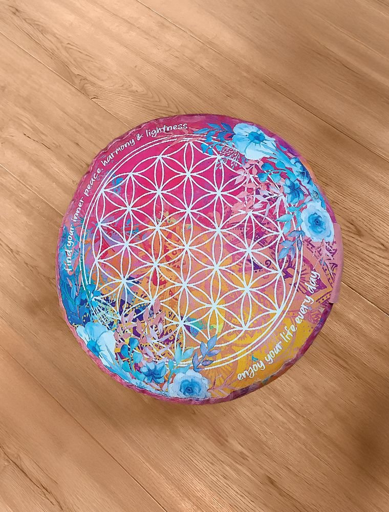 Dieses Meditationskissen ist wendbar. Auf einer Seite befindet sich das florale Mandala, auf der anderen die  Blume des Lebens  . Das Motiv der Blume des Lebens unterstützt Ihre innere Harmonie und fördert Ihr Wohlbefinden – perfekt für jede Meditation. Um die Blume des Lebens herum steht die  positive und stärkende Affirmation  „Finde deinen inneren Frieden, deine Harmonie und deine Leichtigkeit“ und „Genieße dein Leben jeden Tag“. Das Kissen ist mit  deutschem Bio-Dallarmfell