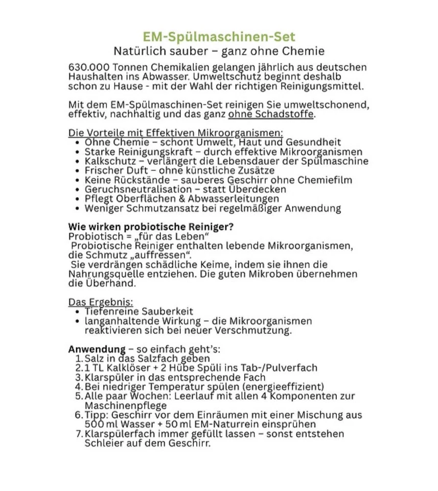 Das EM-Reiniger Set für die Spülmaschine ist die perfekte Lösung für eine chemiefreie Reinigung. Hergestellt mit effektiven Mikroorganismen, sorgt dieses Set für eine gründliche und nachhaltige Reinigung Ihrer Spülmaschine. Einfach in der Anwendung und für den täglichen Gebrauch geeignet, bietet dieses Set eine umweltfreundliche Alternative zu herkömmlichen Reinigungsmitteln. Die Kraft der effektiven Mikroorganismen beseitigt zuverlässig Schmutz und Bakterien, während sie gleichzeitig die Umwelt schont. Machen Sie Ihre Spülmaschine sauber und hygienisch, ohne Chemikalien und schädliche Rückstände – mit dem EM-Reiniger Set für die Spülmaschine.