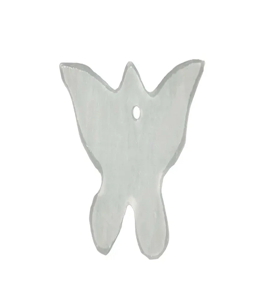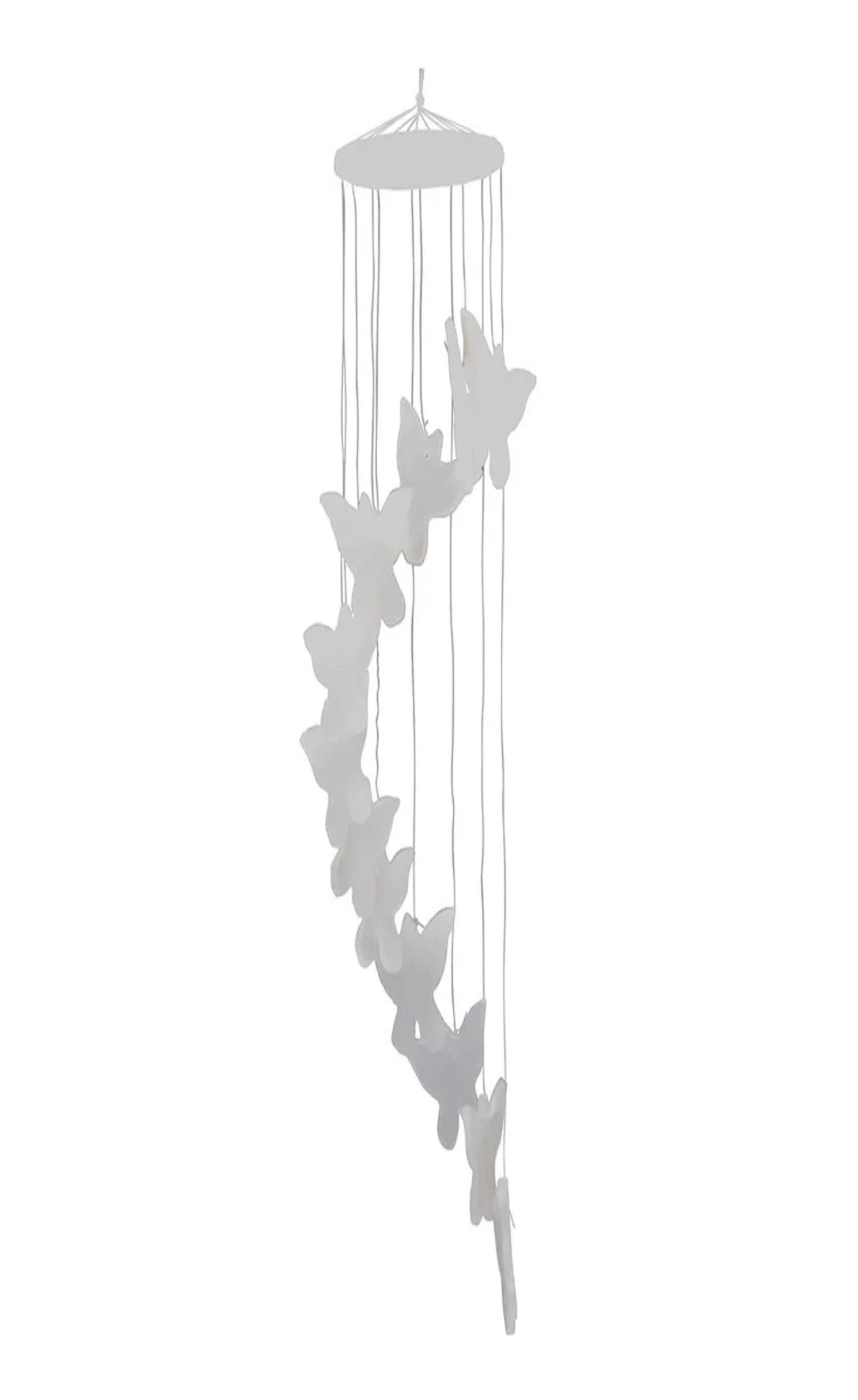 Die Schmetterlinge für diese Windspiele sind aus weißem, leicht durchscheinenden Alabaster-Calcit gefertigt worde. Jede Schmetterling ist ca. 4 x 5cm groß und zeigt die typische dezente Struktur des Minerals.