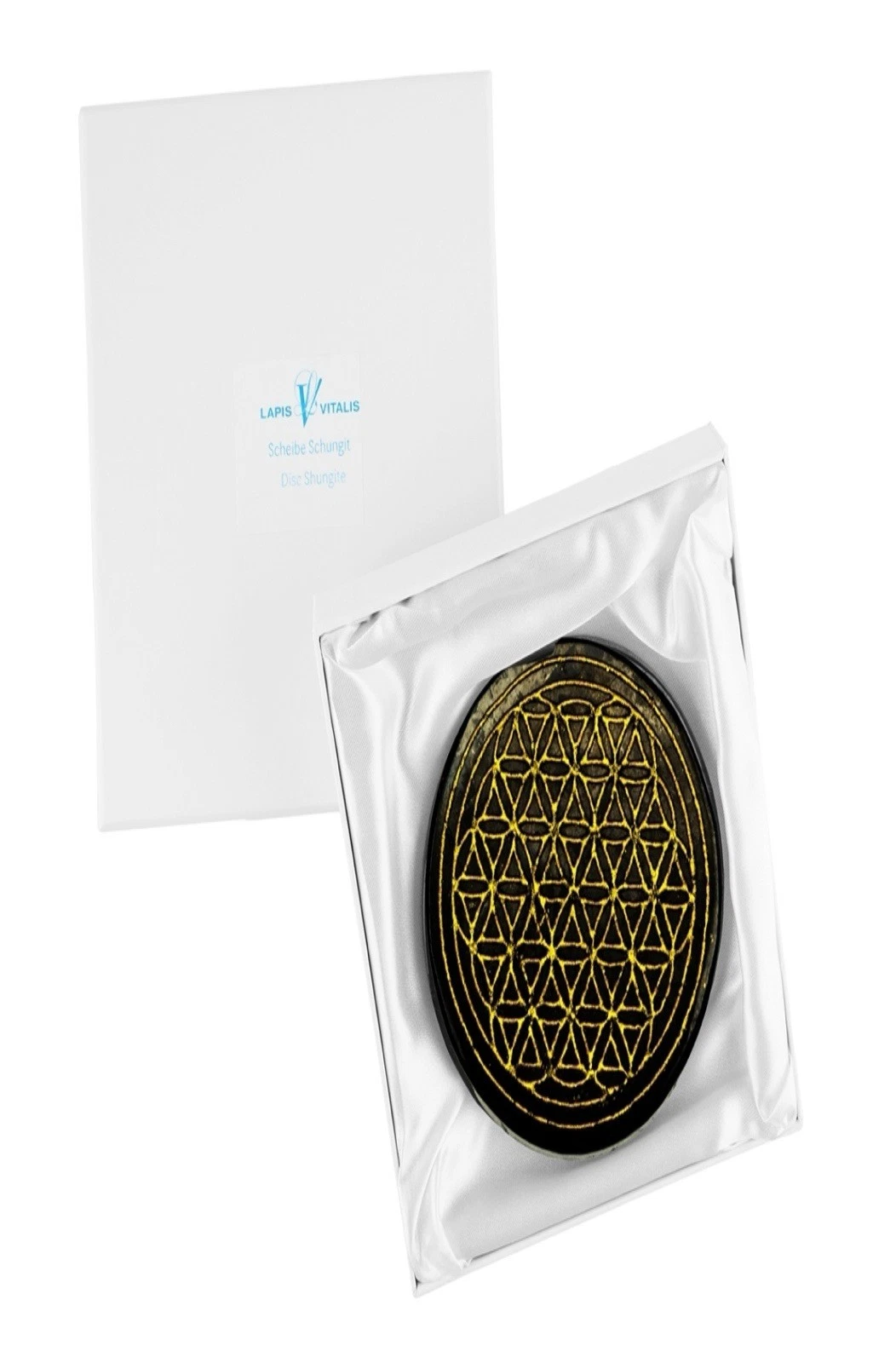 Sie erhalten die Scheibe aus Shungit (stab.) in der beliebten Lapis Vitalis-Geschenkbox.
