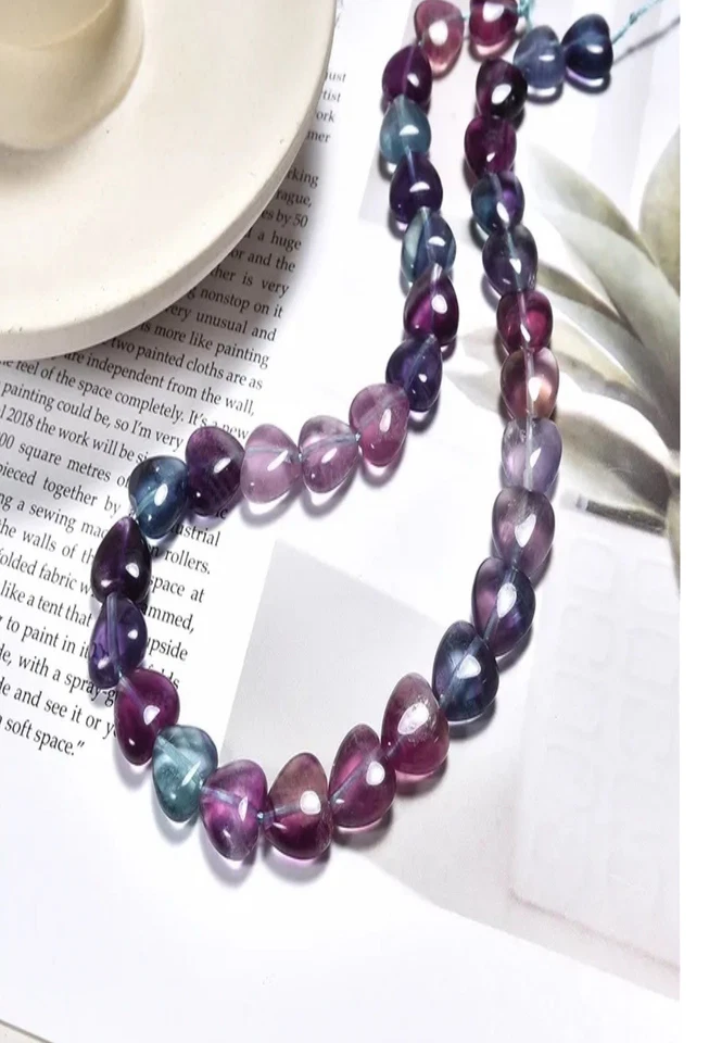 Herz ist Trumpf bei diesem Strang mit überwiegend violetten und mehrfarbigen Fluoritherzen!